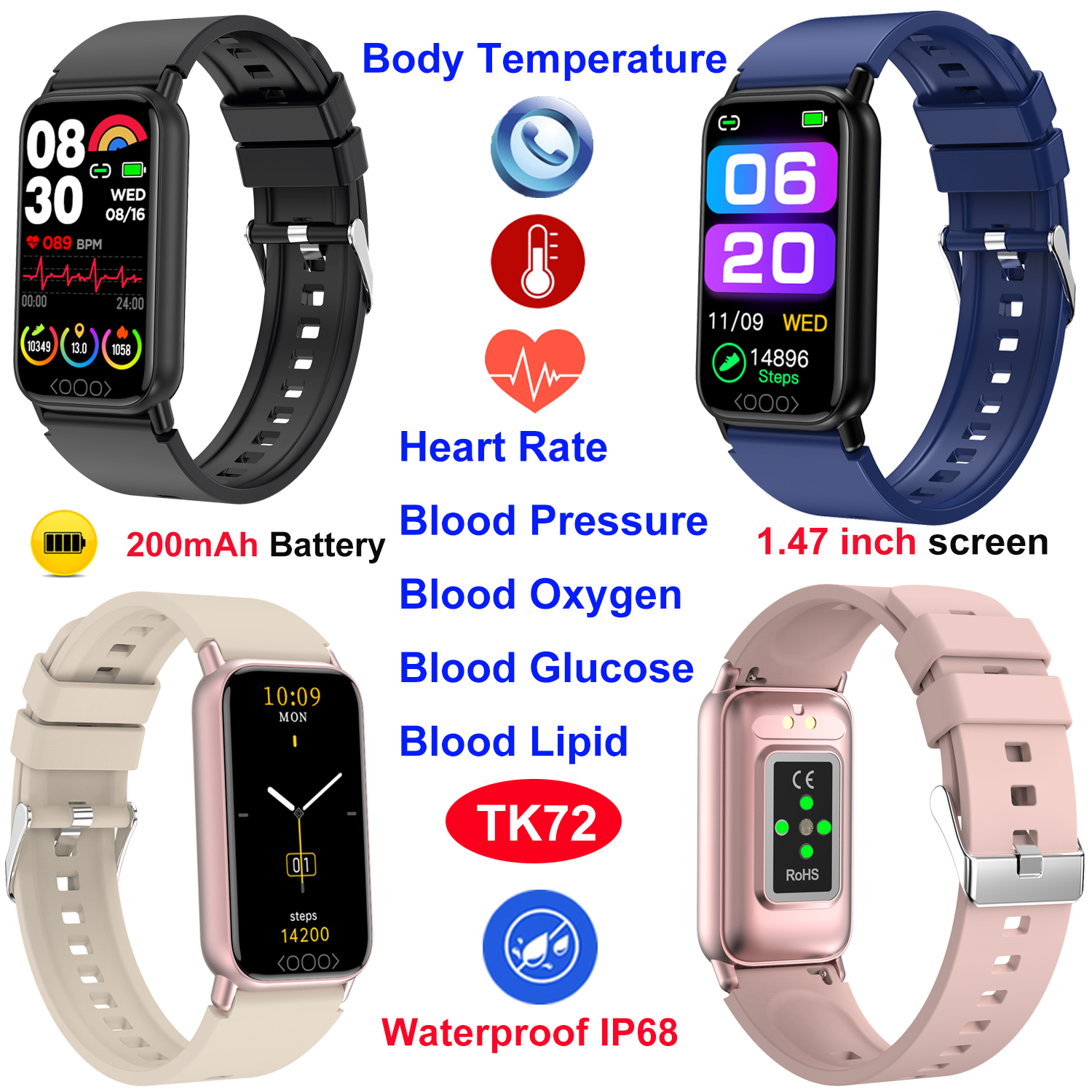 IP68防水男士女士智能运动手环带体温心率血压血压血糖血脂监测TK72