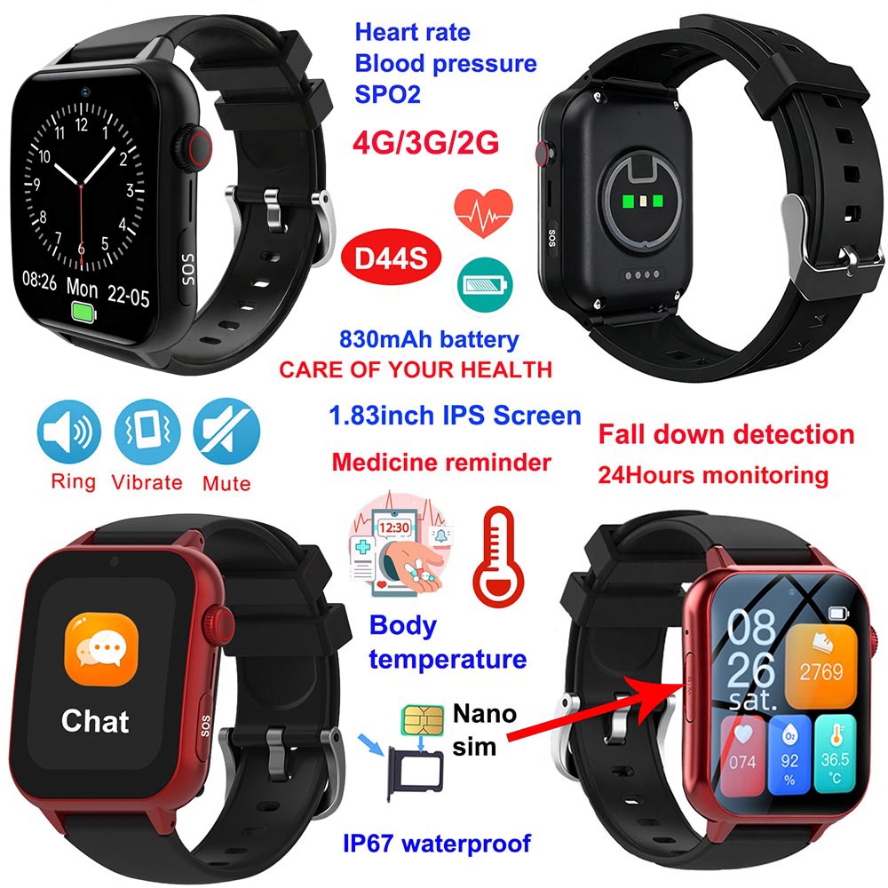 4G IP67 防水成人老年父母弧度屏幕智能医疗 GPS 手表,具有 跌倒检测 和 心率/血压/血氧/体温 监测功能,用于健康监测 D44S (适用于朝觐、朝圣者和副朝安全跟踪器)